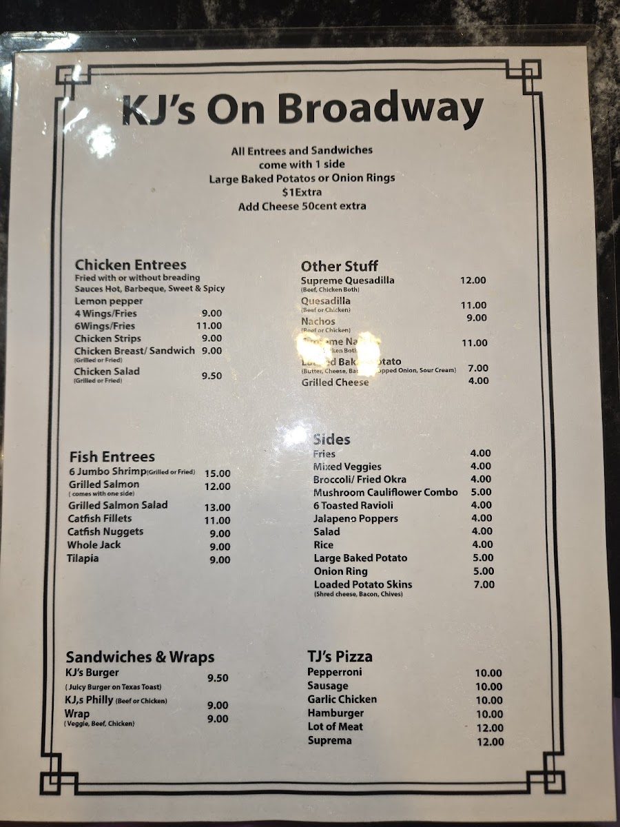 Welcome to KJ's Bar & Grill, a vibrant dining spot located at 5300 N Broadway, St. Louis. This black-owned gem offers a delightful mix of bar food and sophistication, making it a favorite among locals. The menu is a tantalizing journey, featuring everything from jalapeno poppers and stuffed baked potatoes to flavorful chicken wings and cheesy quesadillas.